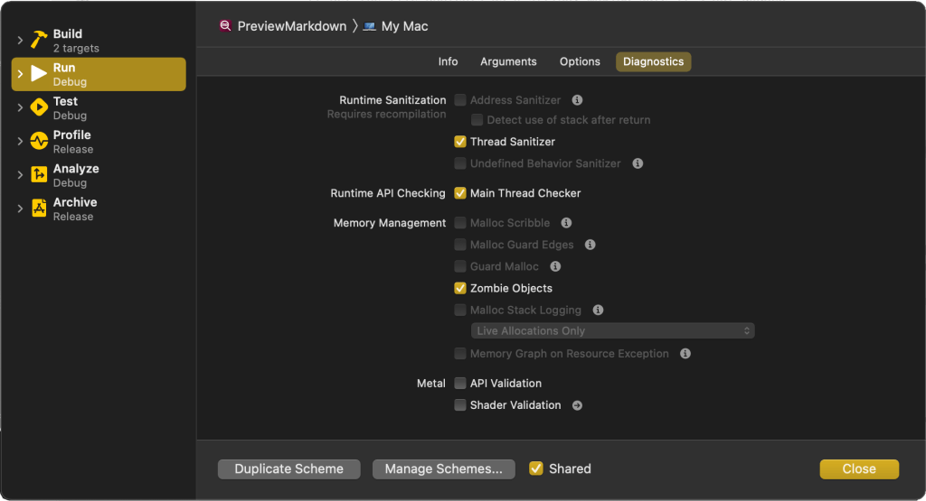 - Find out about Xcode diagnostic tools: not only Instruments but also the Address and Thread runtime sanitizers — they can provide valuable guidance.