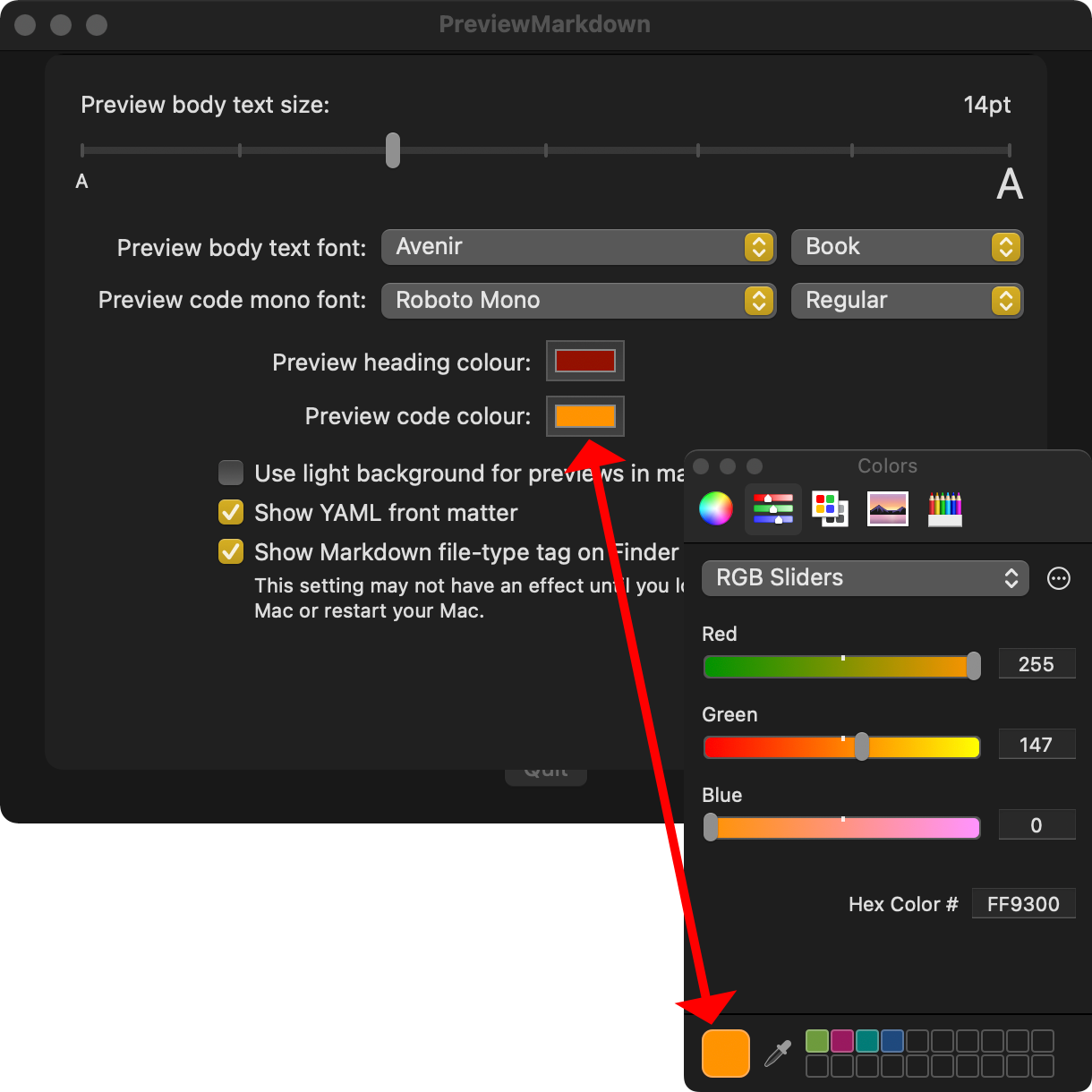 PreviewMarkdown and PreviewYaml use colour to highlight different parts of the presented file content: YAML keys, for instance, and code blocks in Markdown. Earlier versions provided a set of pre-defined colours, but some users wanted to apply different colours, so the new releases provide colour selection through the standard macOS colour picker: