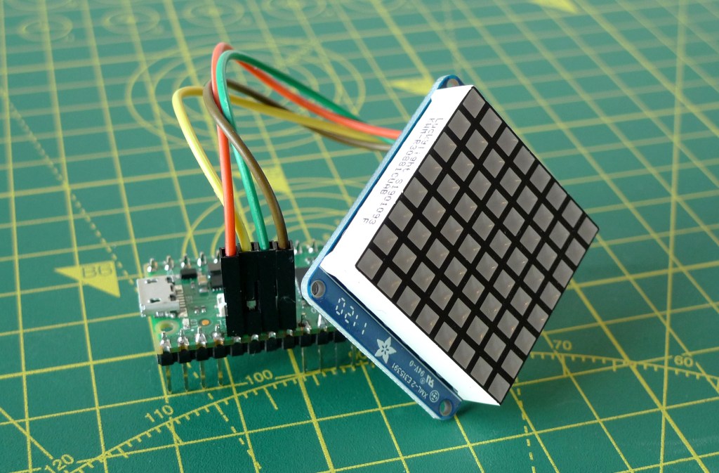 As I noted earlier, the PicoWireless was designed to clip directly onto a Pico’s male headers. When you fit headers to the Pico, don’t solder Pico pins 5, 6, 7 and 8. Instead carefully push those pins up through the Pico. You’ll end up with underside pins onto which to fit the PicoWireless, and four pins up top with which to connect the 8×8 LED matrix’s I²C backpack. Why those particular pins? They’re not used by the PicoWireless and provide a GND (8), two i2c0 pins (6 and 7), and a plain GPIO pin (5) that you can use to power the matrix — the code sets the pin as a 3V3 output. Just wire the I²C backpack to those four pins.