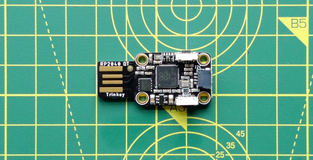 For this technique I’m using CircuitPython running on an Adafruit QT2040 Trinkey, which is an RP2040 chip on a very compact board featuring a male USB A connector, a Stemma QT/Qwiic connector, 8MB of Flash and not a lot else. But it’s a good way to hang I2C devices off your computer, using the programmable Trinkey as a go-between.