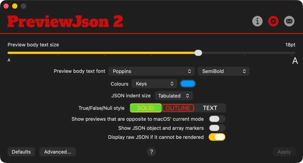The new release incorporates two key changes: a completely refreshed UI and a new JSON rendering engine. The former was straightforward: it follows the pattern laid down by my other QuickLook-oriented apps, PreviewCode and PreviewMarkdown. The goal of the revamped UI is to make more clear how to personalise the look of JSON file previews on the desktop, and more quickly to achieve.