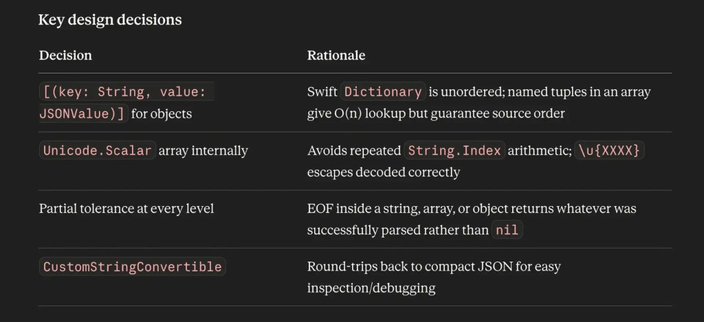 The engine replacement was trickier. The previous renderer did the job, but had an irritating flaw: JSON objects’ keys could appear out of order. The JSON standard doesn’t mandate ordering, so Apple’s Swift JSON decoder doesn’t guarantee to output Swift data structures that match the order of elements in the original JSON text.