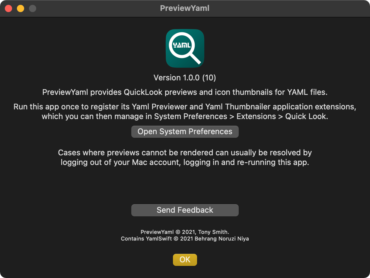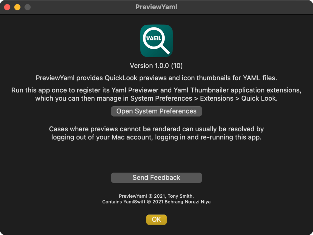 Last week I announced the release of a new version of PreviewMarkdown that will preview YAML front matter in Markdown files. Work on that release prompted me to code a new app that enables QuickLook previews and Finder icon thumbnails of YAML files.