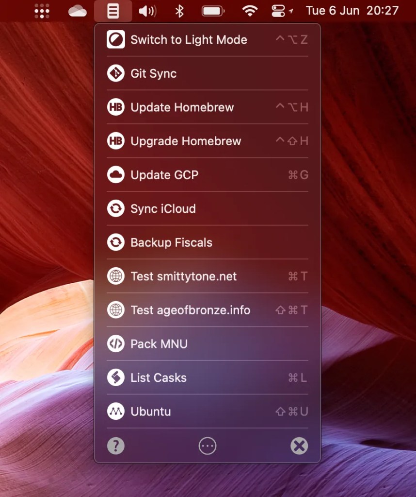 MNU is a tool I use every time I work on my computer. It’s a menu bar utility that allows me to trigger command line scripts and tools with a couple of mouse clicks. Despite its utility to me, I haven’t given it any love for some time, so I recently remedied that with a spring clean of the code. I also added a new feature: custom keyboard shortcuts.